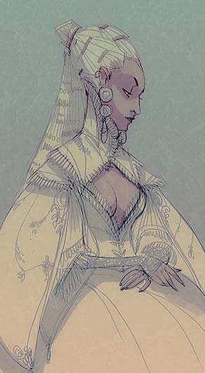 Cuando su nave aterrizó en la plataforma de recepción, se encontró con que la Dama Lara tenía visita. Una mujer ataviada con ropas nobles hablaba con ella.
